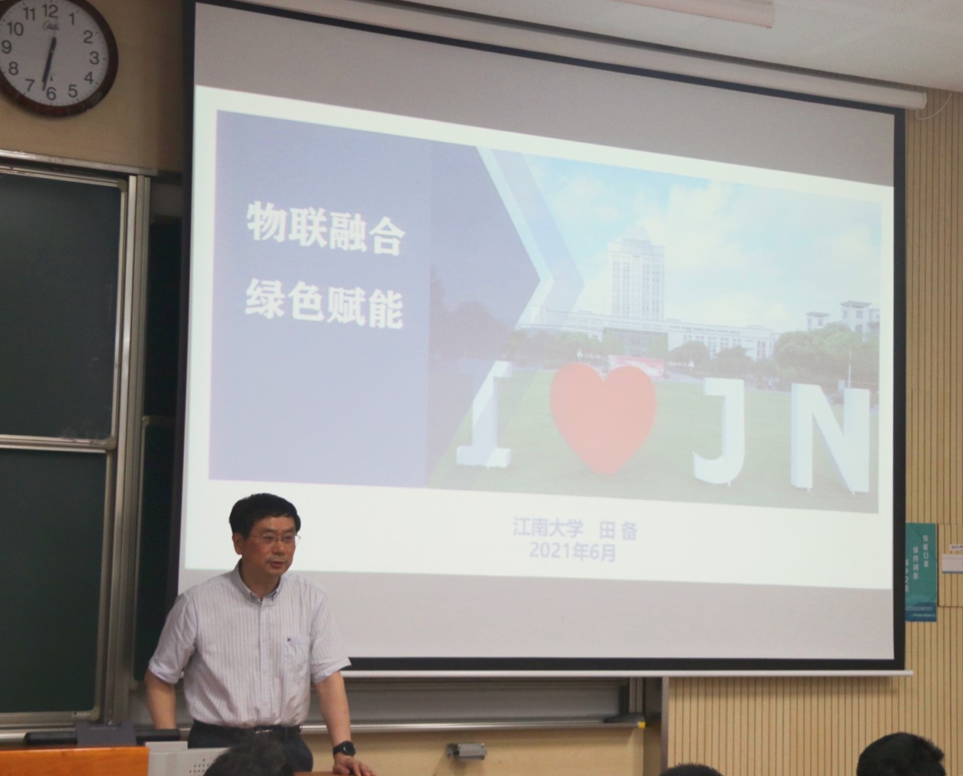 6月9日晚,江南大学副校长田备为机械工程学院学生讲授题为《物联融合 绿色赋能》的思想政治理论课。机械工程学院党委副书记方俊等老师参加此课程。