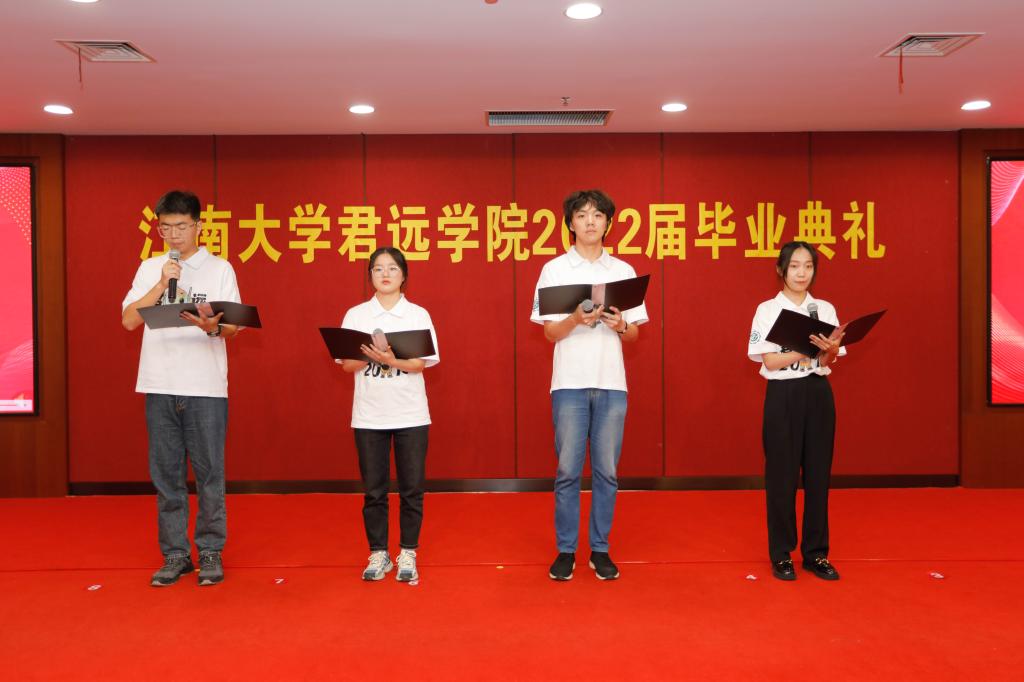 接下来,毕业生代表沈钰涛发言。他深情回顾了本科四年美好的校园生活,表示,“君远所有温暖的记忆都将铭刻在我们内心深处,那是生命中最难忘的日子。我们愿用一生的实践践行‘知行合一、追求卓越’,将它们内化于心,矢志如铭!”