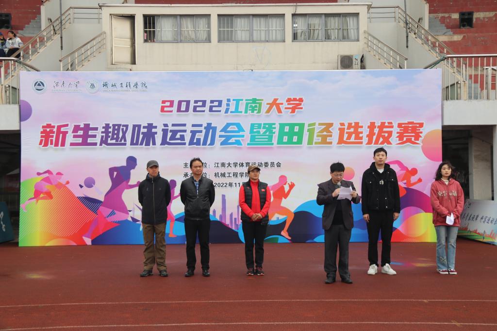 为丰富学生的校园生活,激发学生的体育兴趣,培养学生健康向上、团结合作的精神,营造热情阳光、朝气蓬勃的校园氛围,11月13日,2022年江南大学新生趣味运动会暨田径选拔赛在校体育中心举办。本次比赛由江南大学体育运动委员会主办,机械工程学院承办。江南大学体育部副主任戴平,机械工程学院党委副书记、副院长方俊,竞赛训练管理中心主任龚宁,本次赛事裁判长余亮、辅导员高鑫及各学院代表队出席了开幕式。