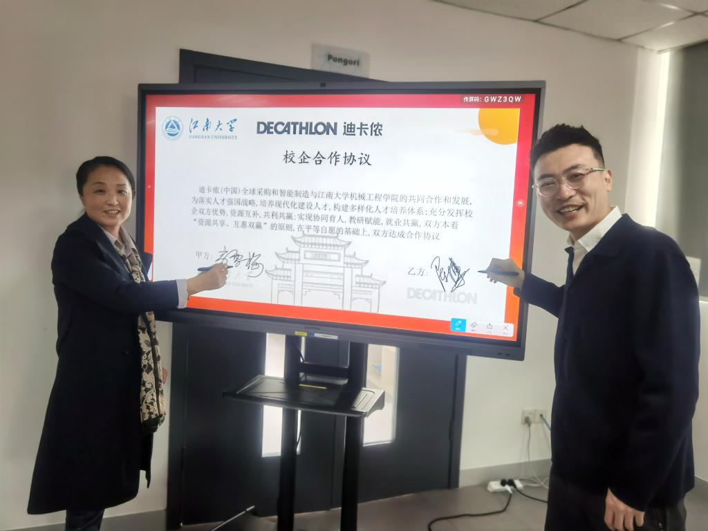 双方再次签署了校企全面合作协议。签约后,迪卡侬中国生产校企合作负责人吕云飞作专题报告。他介绍了迪卡侬公司历史发展、产业布局、创新发展方向及未来战略等。2019届校友、迪卡侬供应链主管曲星茹结合工作经历,讲述自己从卓工实习生成长为供应链主管的故事。与会同学从职业规划、能力培养和未来发展等方面与校友们进行了深入交流。