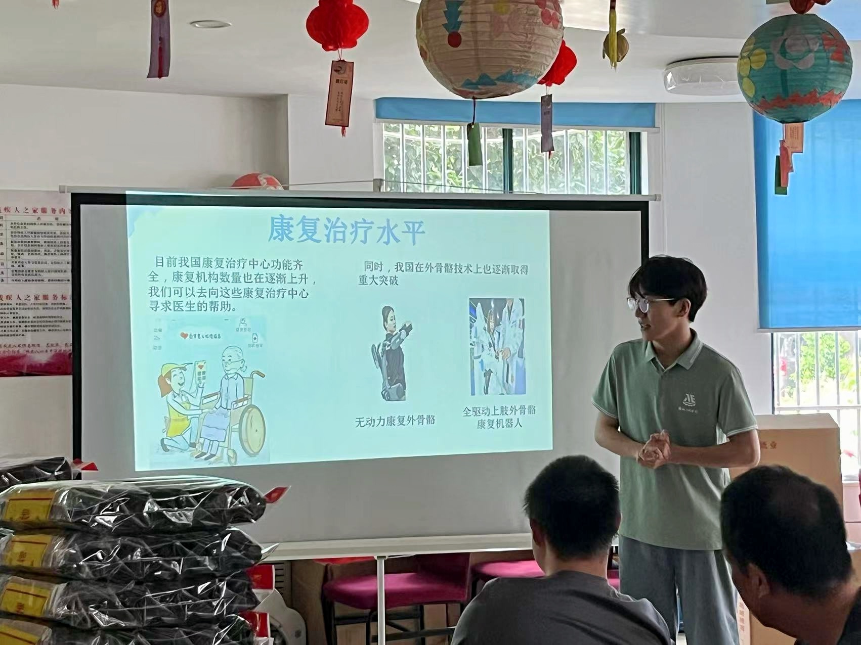 以更好帮助残友们提高身体控制能力、适应社会生活为标准,在宣讲中,团队成员向残友介绍部分适合他们的康复治疗手段,并由贾子璐、杜天天二位同学提出在除机器康复等治疗手段以外的日常生活中可以通过适当的运动健体操,例如“八段锦”“五禽戏”等提高残友们的身体机能和对身体的控制能力。并在三天的学习和动作难度评估后,在宣讲过程中教学了“虎举”“虎扑”“鹿奔”“熊运”“熊晃”五式。