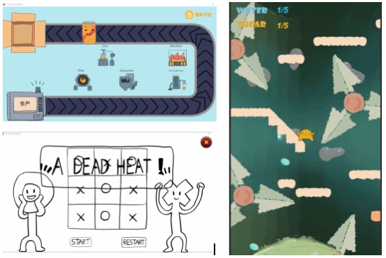 工作坊期间,同学们从食品生产这个主题入手,旨在设计出帮助食品专业的学生在玩游戏中学到知识的严肃游戏原型。在工作坊正式开始之前,同学参加了六次小型研讨会提前熟悉严肃游戏和食品生产基础知识并锻炼了英语口语能力和小组合作能力。工作坊的学习一共分为三个阶段:严肃游戏的概念学习、纸质原型的设计、数字原型开发。第一阶段,教授们展示了一个非常基本的游戏Tic-Tac-Toe,学生在改进游戏的设计的过程中理解游戏设计中MDA(Mechanics,Dynaics,Aesthetics)模型的功用。第二阶段,结合食品生产线展开头脑风暴,学生们选择最佳的游戏方案迭代开发纸质原型。第三阶段,艺术同学用PS游戏场景和角色,技术同学用UNITY编写代码实现游戏功能,共同开发数字原型。同学们发挥各自的专业特长,设计游戏,绘制图形界面,编写程序,亲身参与游戏设计和开发的全过程。
