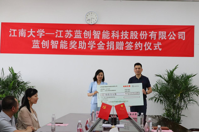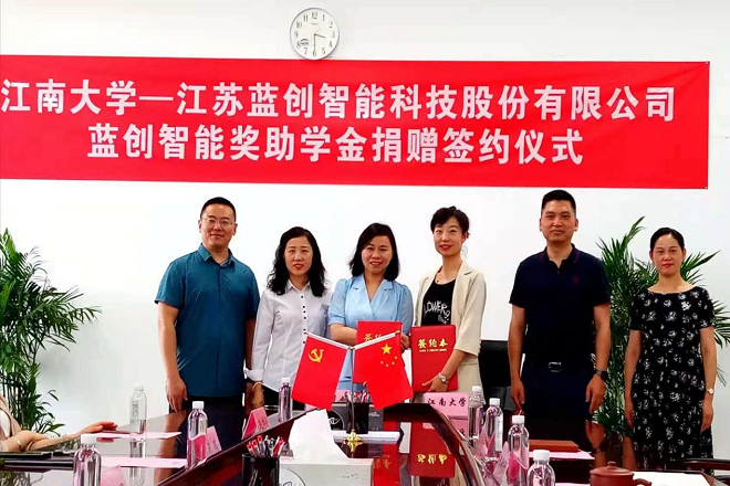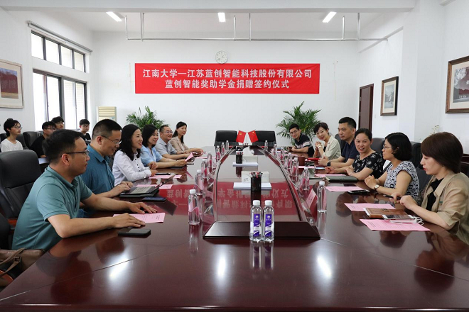 6月17日下午,蓝创智能奖助学金签约仪式在人工智能与计算机学院610会议室举行。江苏蓝创智能科技股份有限公司董事长黄红娟、副总裁赵婵娟、轮值CEO张雪玲等一行六人莅临签约仪式现场,江南大学社会资源处副处长窦新华、人工智能与计算机学院党委书记张华、数字媒体系主任邓赵红、计算机系副主任陈璟等参加签约仪式。仪式由学院党委副书记兼副院长陈祎主持。