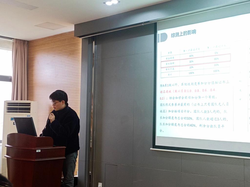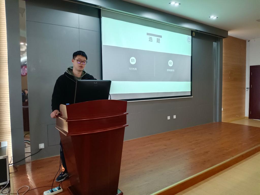 学生代表姜博文和杨涵作参赛经验分享。姜博文主要从选题的创新性以及答辩PPT的美观性两方面进行了分享交流。杨涵从参赛意义、参赛流程、选题、项目实现以及答辩展示等方面分享了自己的经历。在场同学积极互动,从如何备赛以及如何找到合适的选题等方面提出了问题,两位学生代表一一进行了详细解答。