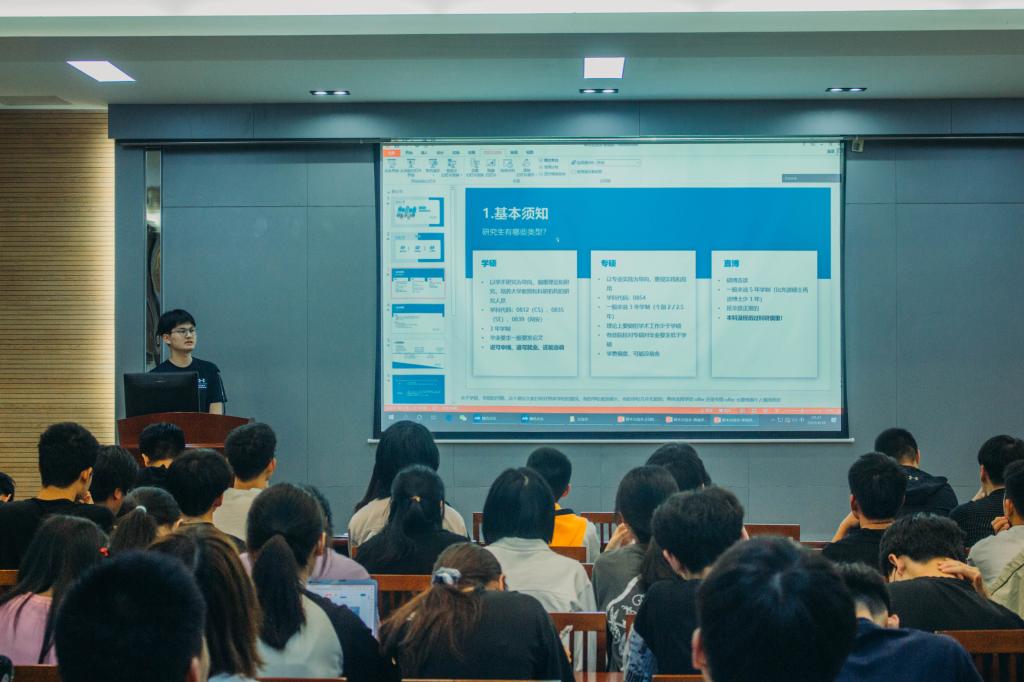 会上,五位优秀的升学学生代表分别从考研资料、考研计划、择校问题、科研生活等多个方面进行了分享,鼓励同学们摆正心态,做好规划,用恒心和信心积极面对考研,提供了极具价值的建议和详细的参考,大幅提升了同学们的升学信心。同时,在场同学积极提问,与分享同学围绕出国深造、二战、保研等话题进行了进一步的讨论与交流。
