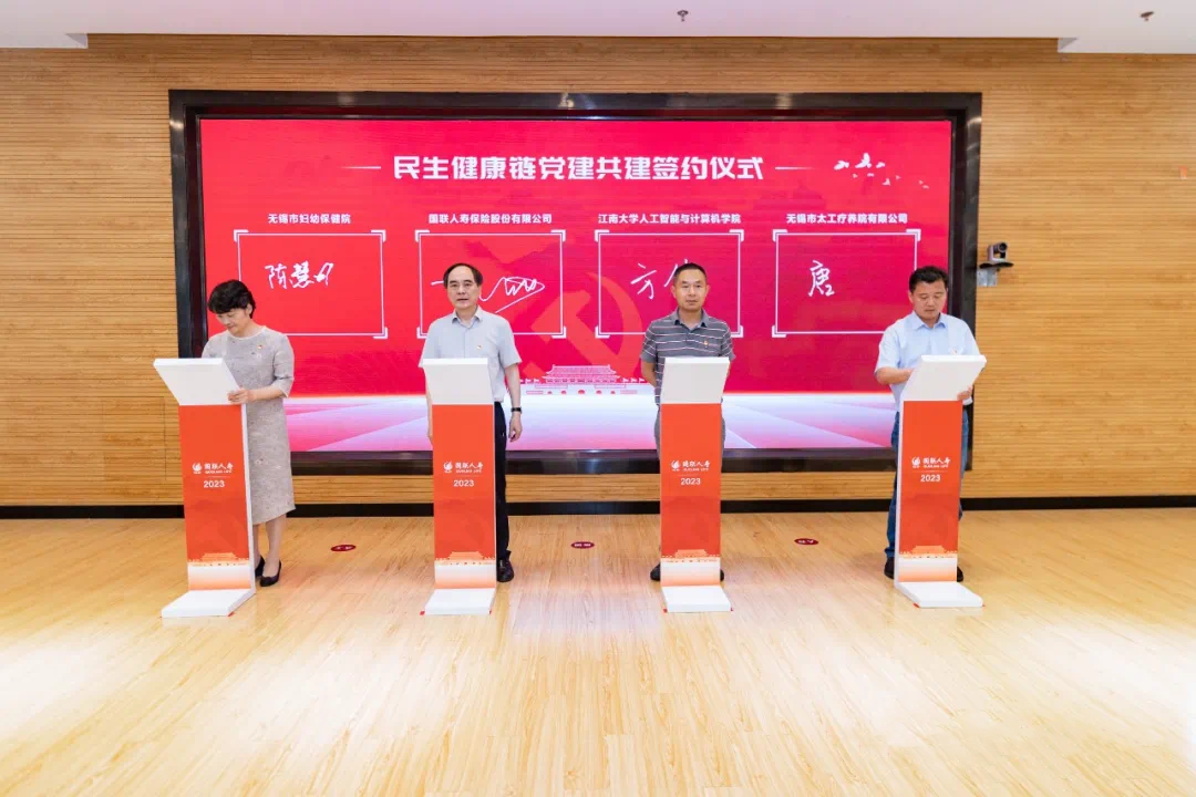 为深入开展学习贯彻习近平新时代中国特色社会主义思想主题教育,扎实开展“四学四担当”行动,庆祝中国共产党成立102周年,6月25日,人工智能与计算机学院与国联人寿、无锡市妇幼保健院、无锡市太工疗养院民生健康链党建共建签约仪式在国联人寿四楼报告厅举行。人工智能与计算机学院党委书记张华,副院长(主持工作)方伟,副院长、计算机教工党支部书记宋威,国联集团党委副书记、工会主席张佐宇,国联集团党委委员、国联人寿党委书记、董事长丁武斌,以及无锡市妇幼保健院、无锡市太工疗养院等单位党员代表参加活动。