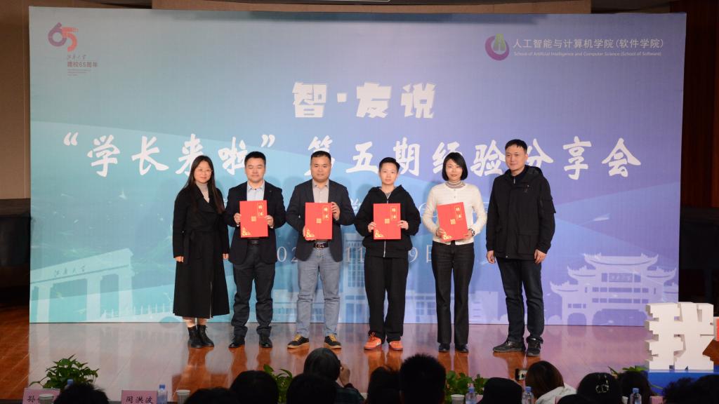 计科2001级班主任顾颖悟老师和校友代表共同为现场学生赠送由100多位校友撰写的回忆文集《桃子熟了》,期待以文字传声的形式让学生汲取奋进力量。王莉莉、宋威共同为四位校友颁发人工智能与计算机学院“生涯规划校外导师”聘书,用校友力量赋能智能学子生涯规划和就业指导工作。