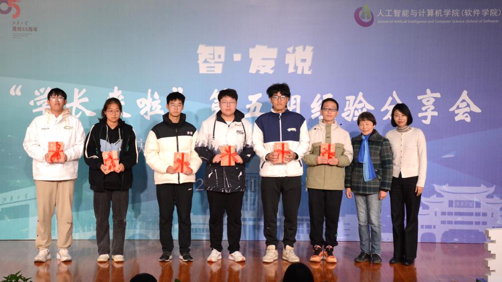 主题分享环节,闵洪波围绕“如何开启AI世界大门”作主题分享,鼓励同学们热爱专业、勇于实践,不断超越自我。杨松从“大学生活的充实与规划”的角度分享了自己大学生活获得的宝贵成长经历,勉励同学们提早规划,迎接更多不确定性。姜卉从“创业十年的风雨历程”中娓娓道来,讲述了从贵州大山一步步走到现在的励志故事。孙创昱从高质量就业的角度,鼓励同学利用好在校时光,多参加科创竞赛、多提升实践经历。