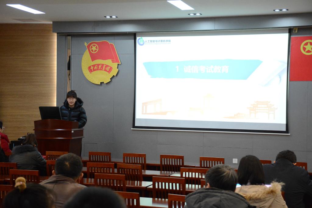 学风辅导员刘震结合学校学风建设和诚信考试宣传教育要求,从召开诚信主题班会、签订诚信考试承诺书、考试违规违纪处理办法等方面做说明,号召班主任在考试周内全方位、多途径、不间断的积极进行诚信考试教育。毕业班辅导员张海月汇报了毕业年级各班级的就业签约情况,并就前期摸排到的重难点问题和下一步工作重点与现场班主任进行了深入交流。心理辅导员杨玉莹传达了《江南大学大学生心理健康教育工作实施办法》《江南大学大学生心理危机干预实施细则》等文件精神,就重点关注的学生群体特征、如何识别学生状态等做了指导。学工办主任兼分团委书记王园园围绕寒假前后学院的团学重点工作进行了部署,着重从时间安排、考试成绩、安全稳定等方面做提醒。