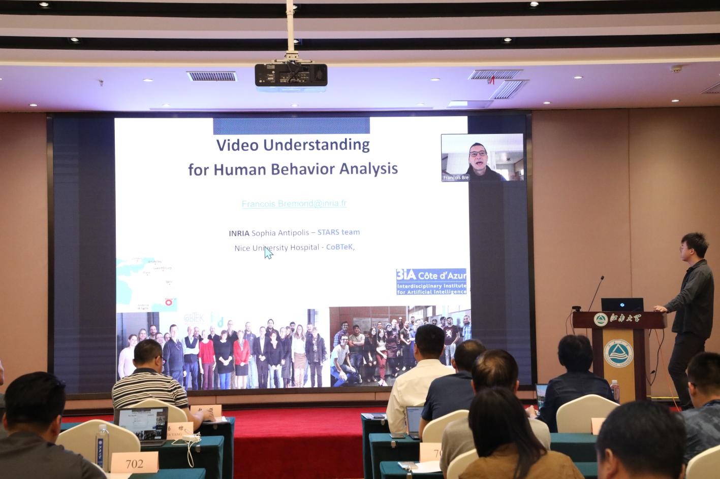 开幕式后,法国国家计算机与自动化研究所弗朗索瓦·布雷蒙研究员做了题为《人体动作监测在医疗健康中的应用(People Monitoring for Healthcare Applications)》的主题报告,江南大学冯振华教授做了题为《形变物体的形状特征抽取及应用(Geometry Feature Extraction of Deformable Objects and Its Applications)》的主题报告。中方与法方的五位专家就人工智能相关领域分别做了专题报告,并与参会人员进行研讨交流。