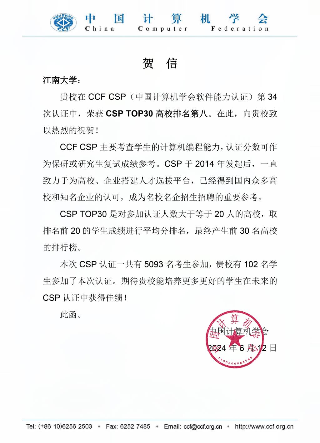 近日,中国计算机学会(CCF)第34次软件能力认证(CSP)在全国98个认证点成功举办,江南大学在本次认证中位列CSP TOP30高校(按前20名平均分由高到低排名)第八。