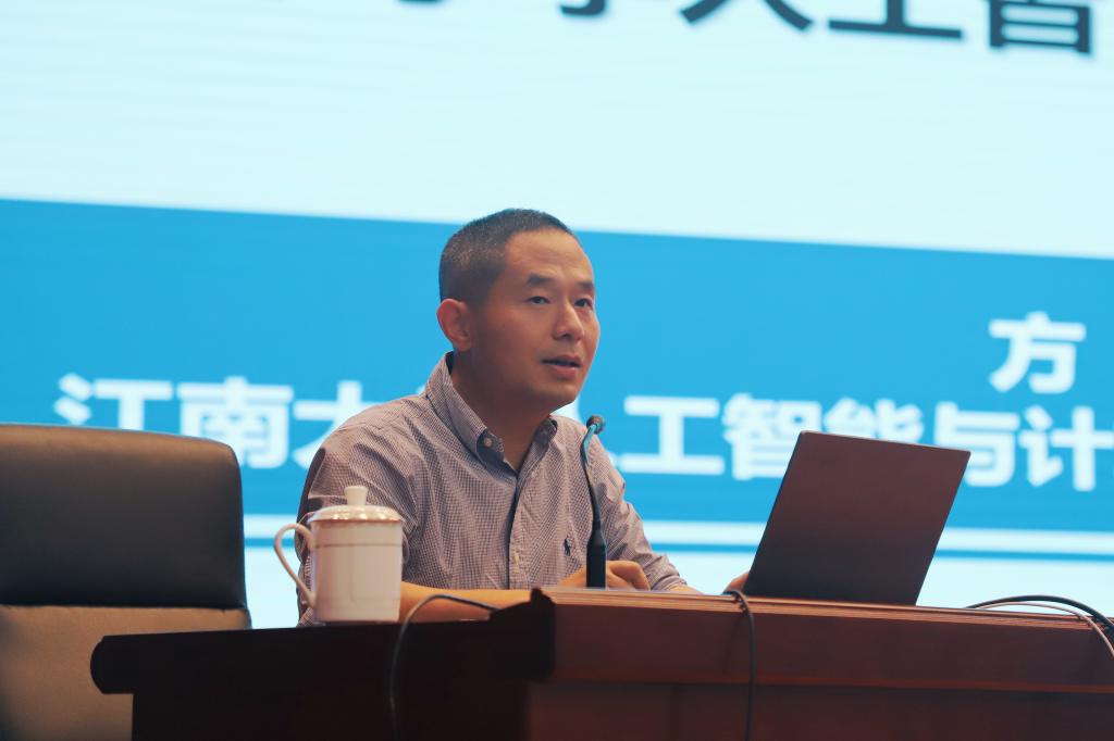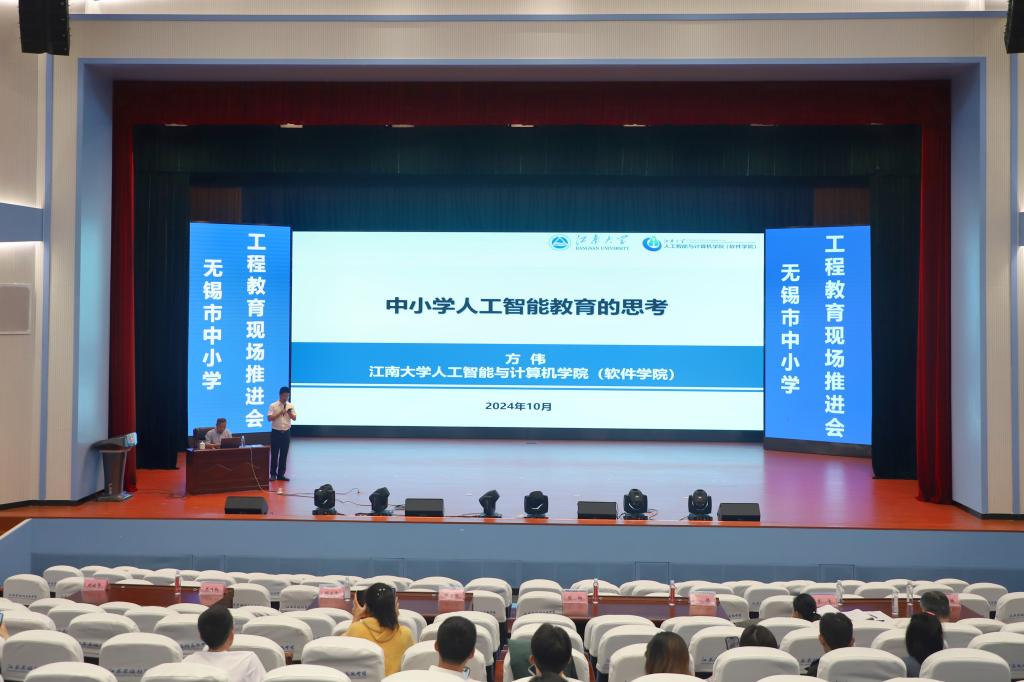 揭牌仪式后,人工智能与计算机学院院长、博士生导师方伟教授应邀为无锡市工程教育“十百千”师资培训班学员做题为《中小学人工智能教育的思考》主题报告。报告从国家政策、教育趋势、无锡实践等三个维度阐述了中小学推进人工智能教育的重要性,并着重从健全教育生态、规范课程内容、提升师资水平、优化实践环境、重视科普活动等五个方面给出中小学推进人工智能教育的江南方案。
