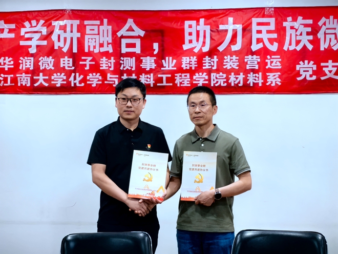 华润微电子封测事业群党支部书记张文飞、化工学院材料系党支部书记杜明亮先后介绍了双方党支部建设情况。华润微电子封测事业群党支部组织委员顾益新宣读《党建共建协议》,明确将以习近平新时代中国特色社会主义思想为指导,通过共建平台、共抓队伍、共享资源、联合攻关等方式,全方位推动院企产学研高质量融合发展。张文飞、杜明亮代表双方签署支部共建协议。未来,双方将共建工作联系小组,建立工作例会制度,在此框架协议的基础上制定共建工作年度规划,拓展活动方案。