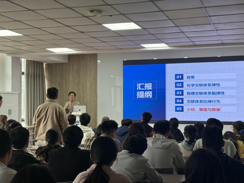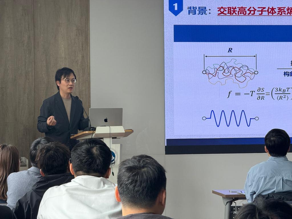 讲座伊始,陈全以流变学理论为根基,系统阐述了交联高分子的黏弹特性与材料设计策略。他首先从流体力学、流变学与固体力学的交叉视角,界定了黏弹固体、牛顿流体、非牛顿流体的基本范畴,结合Kuhn链节与交联密度关系,对比了热固性树脂与弹性体的结构本质。在化学交联方面,他结合橡胶、水凝胶等典型材料,分析了熵贡献与焓贡献在不同体系中的主导规律;在物理交联方面,介绍了物理交联体系在溶胶凝胶转变区间和化学交联体系完全凝胶区间宏观黏/弹特性背后微观链尺度的动力学机制。此外他将基础理论与新材料开发相结合,展示了通过“硬段工程”精准调控高分子黏弹性能的研究成果,为智能凝胶、功能高分子材料的设计开发提供了理论依据与技术路径。整场报告内容严谨、逻辑清晰,兼具理论深度与应用价值。