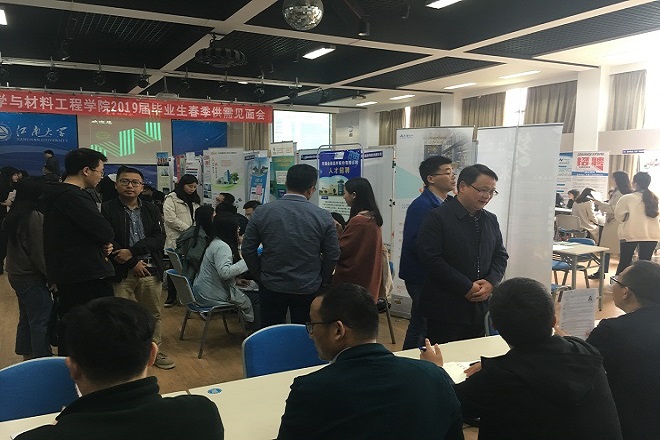 3月29日下午,“化学与材料工程学院2019届毕业生春季供需见面会”在江南大学北区大学生活动中心成功举行。院党委书记潘庆伟、副书记田卫平参加了供需见面会,并与参会企业代表和学生亲切交谈,了解企业需求和毕业生求职进展。