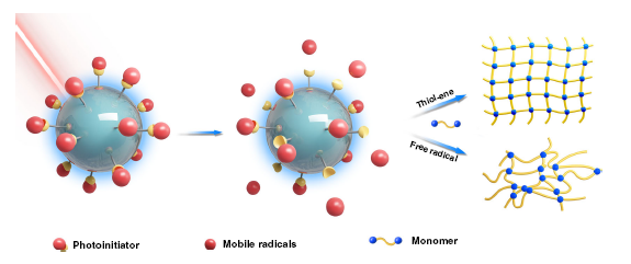 化学与材料工程学院刘仁教授团队前期通过近红外激发上转换粒子原位发射紫外-可见光的策略,首次实现了十厘米级感光材料直接光聚合。在此基础上,为进一步提高近红外光聚合体系的聚合效率,团队将裂解型光引发剂接枝到上转换纳米粒子表面制备了新型近红外光引发剂,该引发剂在980 nm的近红外光辐照下可产生如“蒲公英”种子般扩散的活性种,引发自由基和巯-烯点击光聚合反应(图1)。接枝型引发剂内部存在的Förster能量转移,可有效提升能量转换效率。对比物理混合体系,这种新型近红外光引发剂的自由基产率显著提高(图2),感光材料的聚合效率、活性基团转化率也都得到了明显提升(图3),为高效近红外光聚合体系及其材料发展打开了新的窗口。该研究工作近日以题为“Highly efficient dandelion-like near-infrared light photoinitiator for free radical and thiol-ene photopolymerizations”的研究论文在Nature Communications上发表。