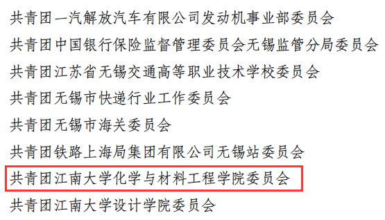 “无锡市五四红旗团委”荣誉称号是共青团无锡市委员会授予全市基层团组织的最高荣誉。化学与材料工程学院分团委将始终坚持“政治建团、思想立团”,加强思政引领和理想信念教育;坚持“固本兴团、改革强团”,传承创新,聚焦基层基础、实践育人;坚持“从严治团”,强“三性”去“四化”,切实改进工作作风,团结带领广大团员青年以实际行动为中华民族伟大复兴中国梦贡献力量。