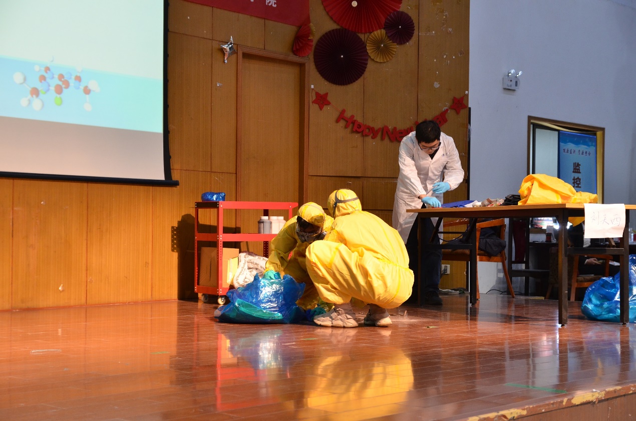 复赛开始前,钱婷婷老师强调了实验室安全的重要性,提醒同学们牢固树立安全意识,在实验室安全问题上,容不得丝毫侥幸心理,并对此次举办的实验室安全知识竞赛对学院安全意识建立的促动效果表示肯定。在经过两轮激烈的角逐,来自刘天西和杜明亮团队的两支队伍进入总决赛,最后的操作题采用了情景模拟的方式,在舞台上为比赛选手模拟出实验室突发事故的现场,要求学生组成应急小组进行现场操作,从防护服、防护面罩等的穿戴到进入突发现场处理破碎的试剂瓶与地上的“浓盐酸”,在从理论知识走向应急处置的过程中,选手的实际操作存在一些不足与隐患。最终,刘天西团队以更加细致严谨的操作获得了本次比赛的一等奖,杜明亮团队荣获二等奖,许虎君和宋启军团队获得三等奖,东为富和王海军团队获得优胜奖,各评委老师及特邀嘉宾为参赛选手进行了颁奖并合影留念。