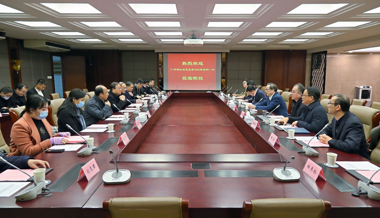 1月22日上午,广州市白云区委书记赵军明、区委副书记潘志军、副区长蔡胜以及白云区各部门主要负责人一行15人来校推进“江南大学-白云美湾国际化妆品研究院”合作共建工作。校党委书记朱庆葆,副校长顾正彪,校长助理张光生,产业技术研究院、化学与材料工程学院等部门和学院负责人,以及江南大学化妆品创新中心负责人参加会议。会议由化学与材料工程学院党委书记潘庆伟主持。