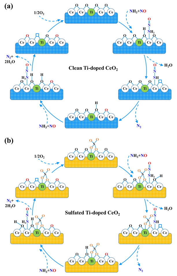 Ce-Ti固溶体催化剂选择性催化还原NOx(NH3-SCR)的反应机理示意图