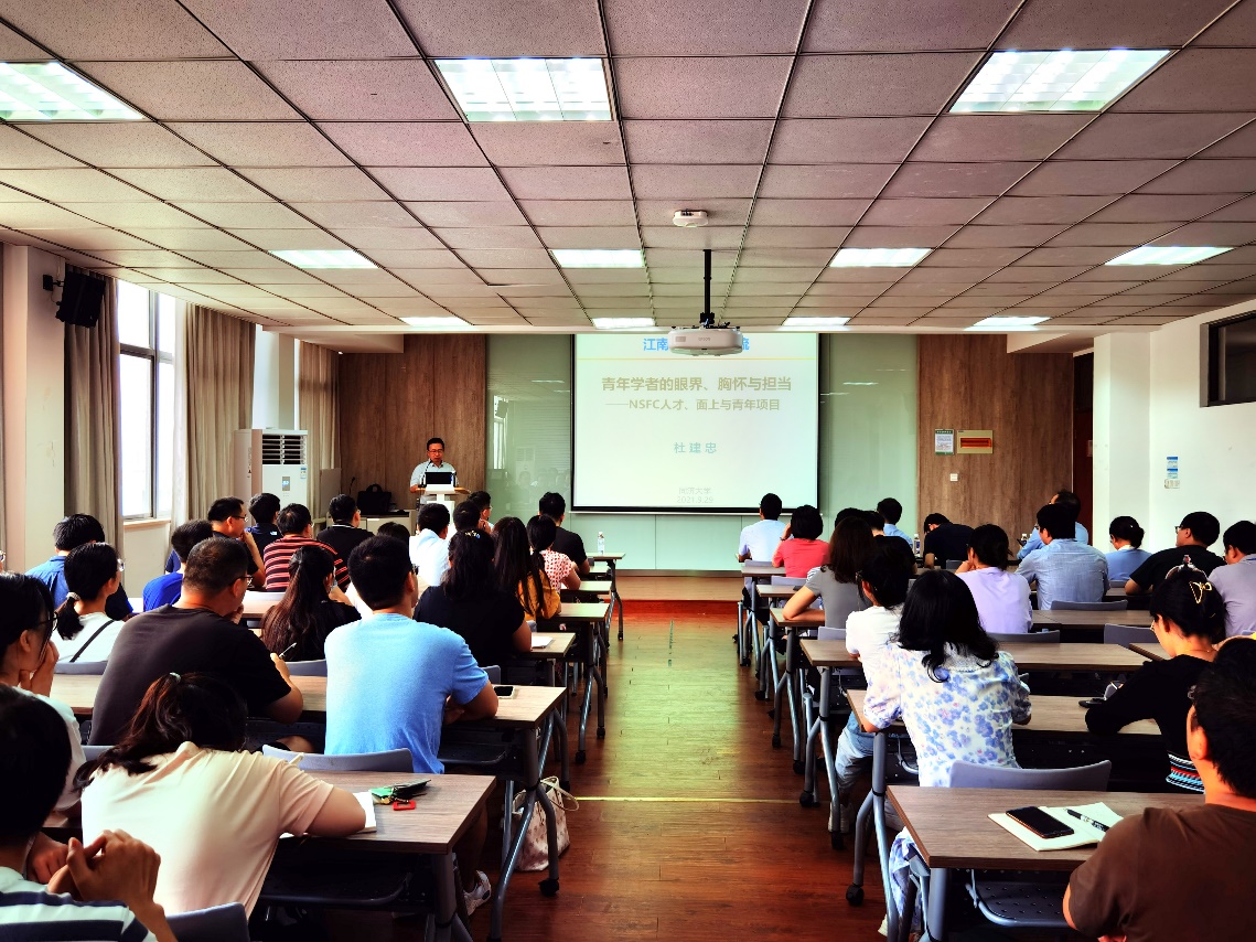 报告会上,东为富对杜建忠教授进行了介绍,并对杜建忠的来访致以热烈的欢迎和衷心的感谢。杜建忠首先介绍了国家杰出青年科学基金和优秀青年科学基金项目,指出杰出青年项目是十年磨一剑的学术积累,深入分析了时代需要什么样的青年学者。接着,他重点介绍了国家自然科学基金的申报工作,全面细致地分析了国家自然科学基金的特点、评阅流程、撰写要点的建议,最后对申报过程中出现的常见问题进行了深入的剖析。杜建忠高瞻远瞩的视野和具有丰富内涵的报告内容,使得在场教师和研究生受益匪浅,感受颇深。