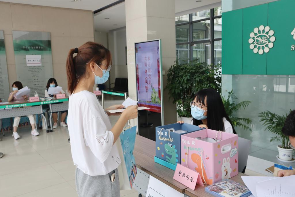 “江南大学的吉祥物是什么?”“江南大学化学与材料工程学院始建于哪一年?”“干粉灭火器适用于哪里?”……学院在迎新现场特别设置了新生“有奖问答”环节,问答题目结合前期对新生开展的各类线上入学教育内容,包含校情院情、党史知识、实验室安全教育等等,负责迎新的老生与新生在现场一问一答,在互动答题中共促成长。此外,学院还贴心地为新生准备了印有迎新元素的手提袋,让新生带着学院的“专属手提袋”,满载着关爱迎接新学期。