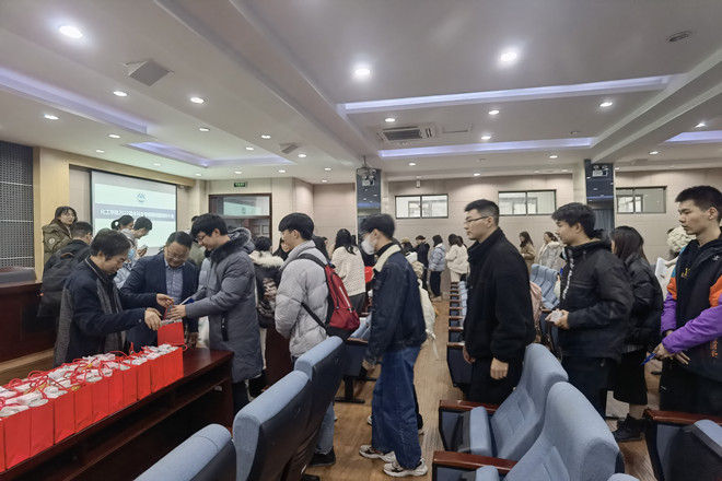 张凯简要介绍了定制徽章、红牛、旺仔牛奶、棒棒糖、花生糖、板栗、果冻、士力架以及班主任辅导员老师定制手写的贺卡等每一件礼品的寓意以及爱心企业赞助的护手霜、面膜、面霜、鲜奶霜等慰问品。随后,与会领导老师共同为全体同学发放了慰问品,同学们在一片欢声笑语中接过了带着学院浓浓情意暖意的礼品,与此同时他们积压的考研压力也得到了一定的缓解。