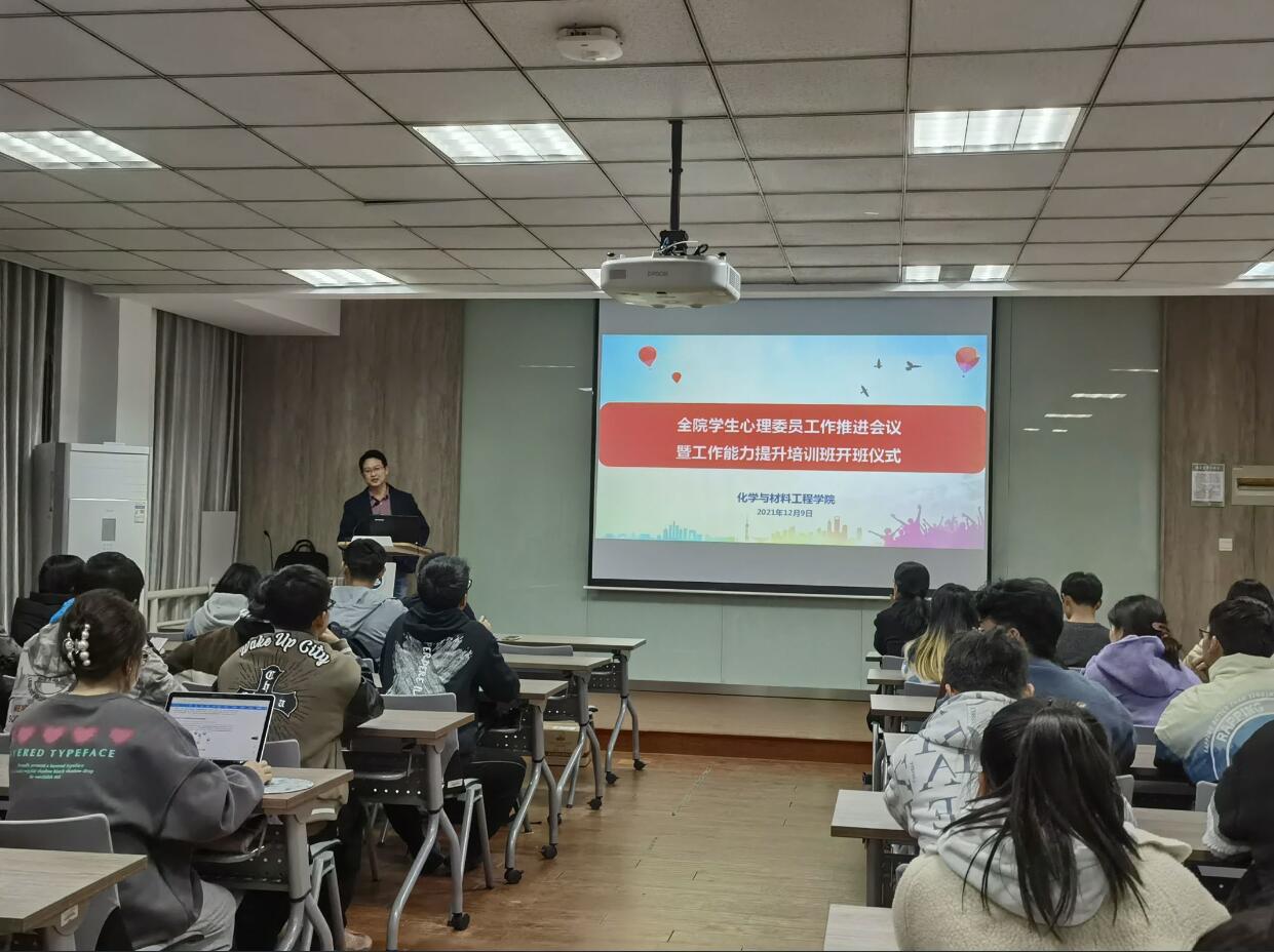 为贯彻落实“全国高校学生心理健康教育工作推进会”会议精神,提升学院心理委员队伍的业务能力和服务水平,促进全院大学生身心健康和谐发展,全面培育大学生的积极心理品质,化学与材料工程学院于12月9日晚召开全院学生心理委员工作推进会议暨工作能力提升培训班开班仪式,院党委副书记、副院长田卫平,全体本硕博学生班级及实验室心理委员64人参加会议。会议由学院心理健康工作辅导员张凯主持。