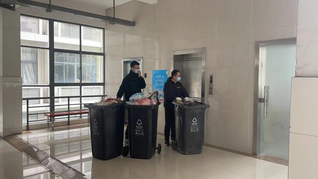 志愿者在化工楼清运垃圾
