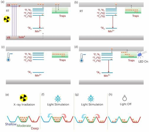无机长余辉材料载流子在缺陷态的填充、释放和再捕获过程示意图