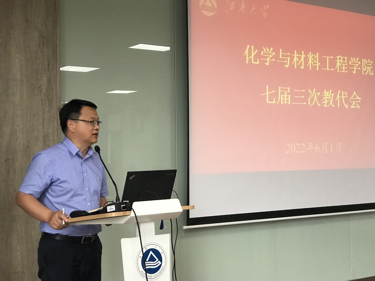 6月1日下午,化学与材料工程学院七届三次教代会在化工楼A316报告厅召开。学院党政班子,来自学院各系部的40余名教代会代表出席大会,部分团队教师代表应邀列席参会。大会由学院分工会主席、党委副书记田卫平同志主持。