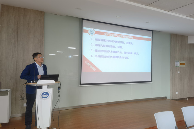 座谈会后,董玉明为毕业生党员们开展了题为“不忘初心、牢记使命;自信诚信,再续辉煌”的学术诚信教育专题党课。董玉明从习近平总书记提出的“新时代人才强国战略”为出发点,详细讲解了新时代党和国家对人才的渴求与实现中华民族伟大复兴宏伟目标之间的必然联系。而实行人才战略,学术诚信是可持续发展的基础。董玉明对此提出四点学术行为准则:确保成果中的科学数据可靠、可重现;确保文献引用准确、完整;建立规范的学术管理办法,便于追溯、核实;形成健全的学术道德和自律习惯。随后,董玉明提出了“个人软实力”的概念,再次对个人诚信的重要性加以阐述强调。党课最后,董玉明向完成学业、顺利毕业,即将迈向人生新征程的毕业生党员们表示了祝贺与期望:“今天我们以江大为荣,明天江大以我们为荣。希望同学们今后在各自的科研领域大展宏图,为中华民族伟大复兴贡献力量”。