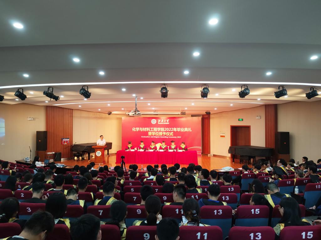 6月17日下午,化学与材料工程学院在北区大学生活动中心举行2022年毕业典礼暨学位授予仪式。学院党委书记潘庆伟,院长东为富,副院长董玉明、顾志国、马丕明,化工系蒋平平教授,全体系主任、辅导员、毕业班班主任,学院2022届本硕博毕业生欢聚一堂,共同迎接这个具有特殊意义的重要时刻。典礼由学院党委副书记、副院长田卫平主持。
