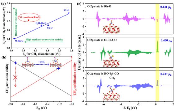 CO-Rh-O配位结构突破Trade-off效应示意图及Rh-O活性位电子结构在反应过程中的动态变化