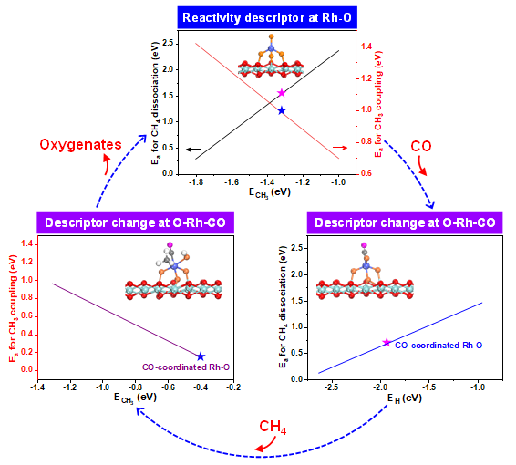 通过综合分析DFT计算与催化实验评价结果,归纳出ECH3和EH是控制甲烷活化与中间物种过度氧化的关键“反应描述符”,揭示了突破甲烷低温氧化Trade-off效应的动态“金属活性位-反应中间体”配位诱导的反应描述符调控机制(图2,3):CO-Rh-O活性中心的电子状态和催化性质随着反应过程中“Rh-反应中间体”配位的变化而动态变化,这引起反应描述符数值在反应过程中动态移动。在甲烷活化时,反应描述符数值位于低能垒区域,而在随后的过度氧化反应中,由于配位环境改变,反应描述符数值移向高能垒区域。这项研究为深刻理解和认识催化反应的动态过程及调控甲烷选择氧化的催化性能提供了新的理念和视角。研究工作得到国家自然科学基金、江苏省自然科学基金和中国博士后基金等项目的资助。