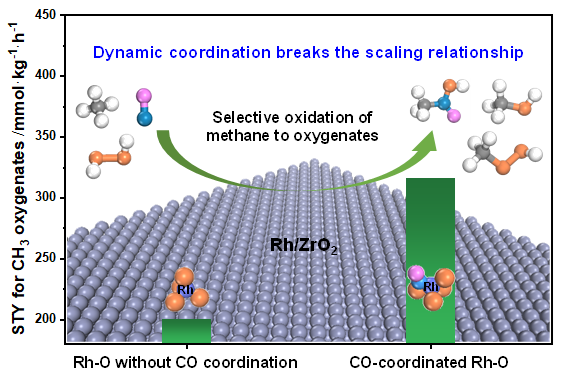 调控催化活性中心的配位环境是提高催化性能的有效手段。然而,目前文献报道主要聚焦在“金属活性中心-载体”之间的配位结构和相互作用,如调变金属活性位与载体的几何结构和配位数、金属-载体化学成键强度(SMSI作用),或双(多)活性中心的协同催化作用等。在本项工作中,化工学院刘小浩团队试图通过反应过程中引入“反应物(或中间物种)-金属活性位”的配位结构和电子性质的动态变化来实现甲烷可控催化转化的突破。基于系统的理论计算和实验研究发现:在原子分散的Rh/ZrO2催化甲烷低温转化的反应中引入CO能有效突破甲烷转化的Trade-off效应,反应过程中形成的CO-Rh-O配位结构不仅促进了甲烷活化和转化,同时提高了中间物种*CH3过度氧化的能垒,这样实现了甲烷转化活性的大幅提升和过度氧化的有效抑制(图1)。