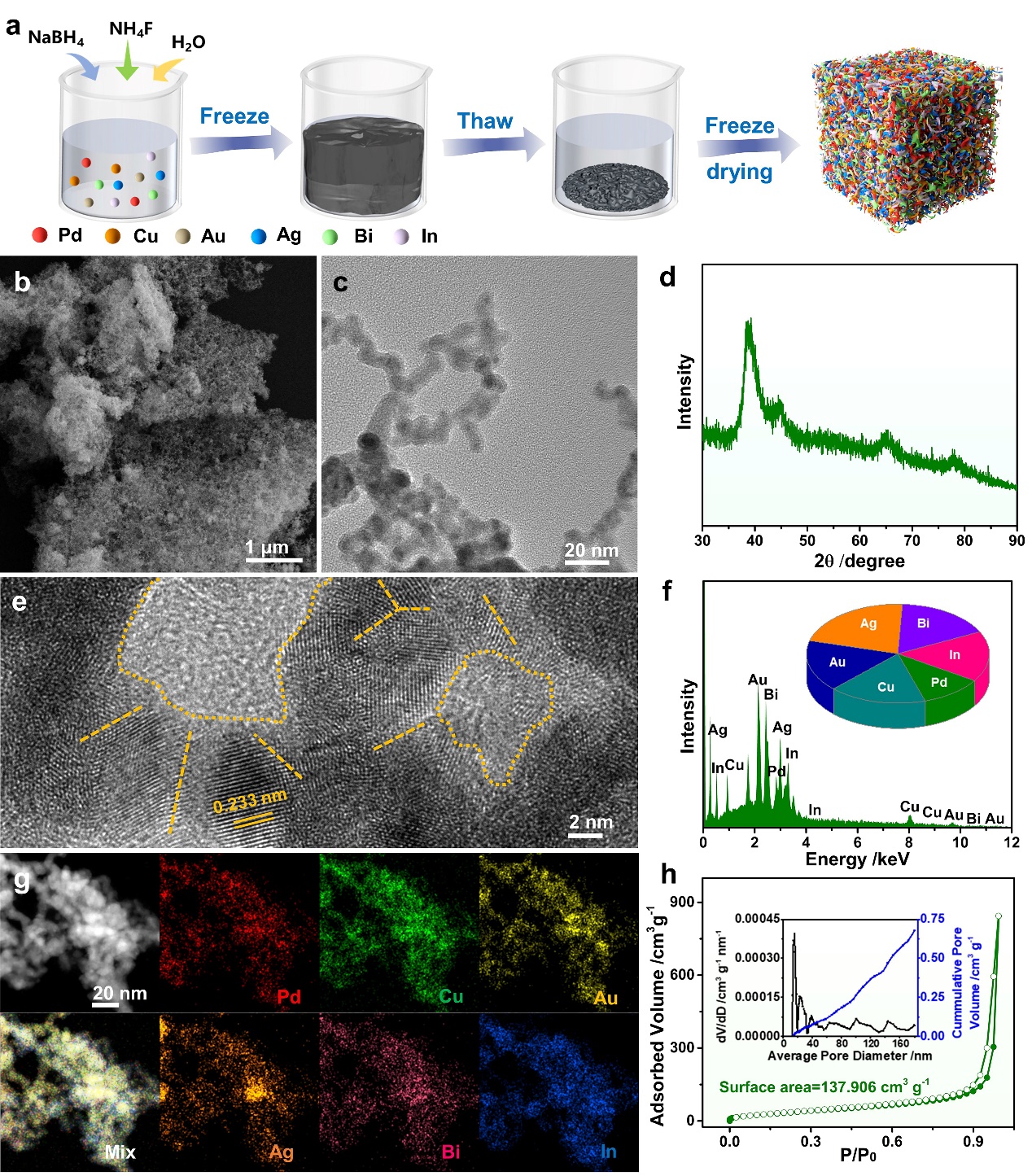 基于此,本研究团队通过冻融法首次实现了高熵合金气凝胶的普适性制备,成功得到了一系列高效稳定的新型二氧化碳电还原催化剂(六元PdCuAuAgBiIn、七元PdCuAuAgBiInCo、七元PdCuAuAgBiInZn、八元PdCuAuAgBiInCoNi以及九元PdCuAuAgBiInCoNiZn高熵合金气凝胶)。机理研究表明,高熵合金气凝胶独特的三维网络结构、金属间的强相互作用以及表面丰富的不饱和位点,调控了其电子结构,优化了催化剂表面HCOO*中间体的吸附和解吸强度,抑制了一氧化碳的吸附及析氢副反应,从而增强了其催化活性、选择性及稳定性。这项工作不仅为高熵合金气凝胶的可控合成提供了新策略,还为高效二氧化碳电还原提供了新的材料平台,并推动了其在催化及其他领域的研究。