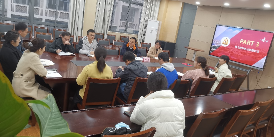 习近平总书记在党的二十大报告中还提到,目前国家科技创新能力还不强,且现在城镇新增就业年均在1300人以上,这些情况与研究生群体也是息息相关的,因此支部各党员同志围绕“科研压力”“就业压力”以及“如何放平心态,停止焦虑”等话题展开了热议。