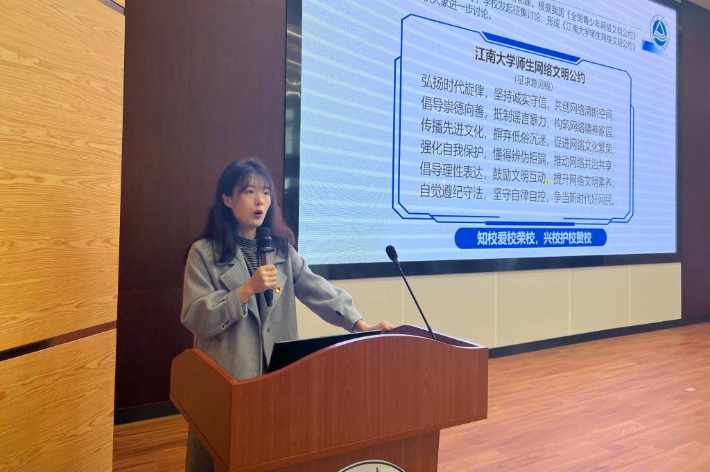 最后,李晓洁带领全体研究生共同宣读《江南大学师生网络文明公约》,树立“知校爱校荣校,兴校护校赞校”的意识和责任。同时,她向全体研究生提出有士气、有规矩、有本领三点要求,勉励每一名化工学子都能在接下来的科研和生活中担当有为,有所作为,不负韶华,奋力前行。