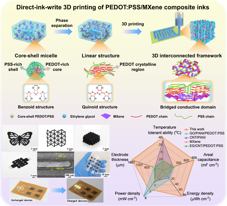 微型超级电容器(Microsupercapacitor)的快速发展,有望满足人们对高电压、高功率密度和能量密度的微型供电器件的需求。相较于传统的微加工技术,墨水直写3D打印(DIW 3D printing)为构建结构可定制的微型超级电容器提供了经济且简便的解决方案,并有望实现储能器件的电化学活性材料的高负载,进而提高器件的能量与功率密度。商品化的导电聚合物PEDOT:PSS,通常具有优异的导电性、高电化学活性和溶液加工性能,作为超级电容器电极材料具有良好的应用前景。然而,基于PEDOT:PSS制备高质量可打印墨水面临着工艺繁琐、环境不友好等瓶颈问题。因此,发展工艺简单、绿色环保的可打印PEDOT:PSS墨水的制备新方法,具有重要的研究和应用前景。