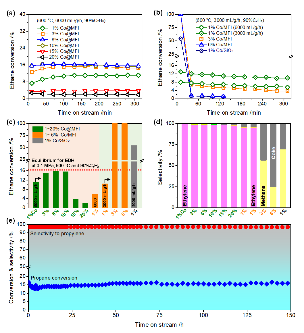 我校刘小浩团队采用一锅法,在无铝环境(即不依赖B酸位点),无需添加配位试剂的条件下一步成功合成了载量高度可调(1~10 wt% Co)的原子级分散Co@MFI催化剂,实现了乙烷在苛刻反应条件下(高乙烷浓度,高反应空速)以平衡转化率、近100%选择性无氧脱氢制乙烯,并表现出优异的催化稳定性。同时,该催化剂也适用丙烷无氧脱氢高效制丙烯,获得近100%丙烯选择性,催化剂稳定运行150 h无任何失活。