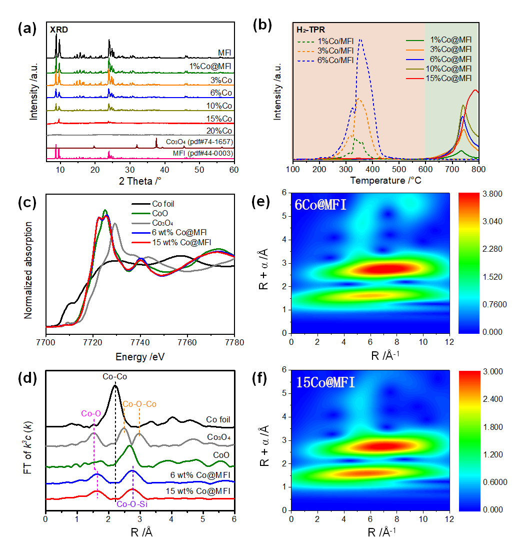 一直以来,将金属离子封装在分子筛孔道或骨架中,需要借助配位试剂(如EDTA、EDA或NH3)以防止金属离子在合成条件下优先沉淀而形成金属团簇。在目前报道的低碳烷烃脱氢金属/分子筛催化体系中,几乎无一例外均使用了各种配位试剂,且金属载量仍然只能维持在较低水平(~1.0 wt%),当金属载量较高时,配位试剂可能会对催化剂合成起到负面作用。因此,如何将金属活性中心根据反应需要成功封装于分子筛中仍然是一种挑战。该研究发现,对于Co2+金属离子可以不依赖任何额外配体合成Co载量高度可调原子级分散的催化剂。