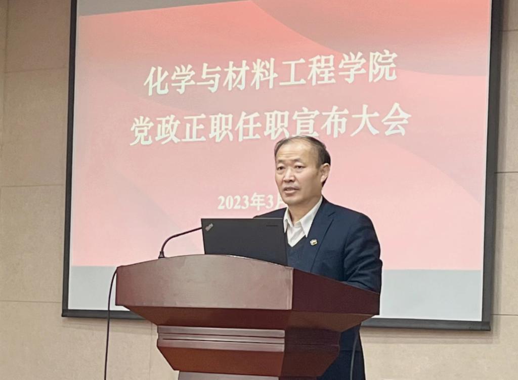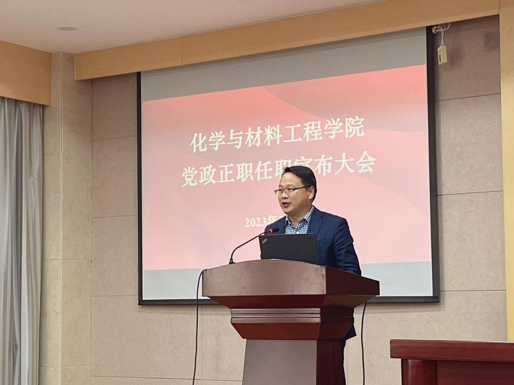 顾正彪宣读了学校党委关于潘庆伟同志、刘仁同志的职务任职决定,任命潘庆伟同志为化工学院党委书记、刘仁同志为化工学院院长。随后,顾正彪作重要讲话,指出这次中层干部的换届调整,既是学校干部任期目标责任制的例行工作,也是优化班子结构、促进改革发展的一项重要举措。校党委严格遵循干部选拔任用规定,经过反复酝酿、通盘考虑和慎重研究后做出以上决定。他对化工学院上一届党政班子在2020-2022年任期中取得的成绩表示高度肯定,对于全体教职工共同努力表示衷心感谢。同时,他对学院新任期、新班子提出了几点建议:一要旗帜鲜明讲政治。坚持社会主义办学方向,坚持立德树人根本任务,强化党政同责、一岗双责意识;二要敢于担当善作为。要抢抓发展机遇,紧扣国家战略和学校发展,在新一轮任期目标的制定实施中,前瞻思考、主动作为,努力开辟发展的新领域新赛道,不断塑造发展新动能新优势;三要团结协作聚合力。牢固树立“一盘棋”思想,围绕中心工作,密切配合、通力协作,将“多条线”拧成“一股绳”;四要以身作则当表率。学院领导班子岗位重要、备受关注,要从严治院、从严律己、从严带队伍,让好作风出生产力、强战斗力。
