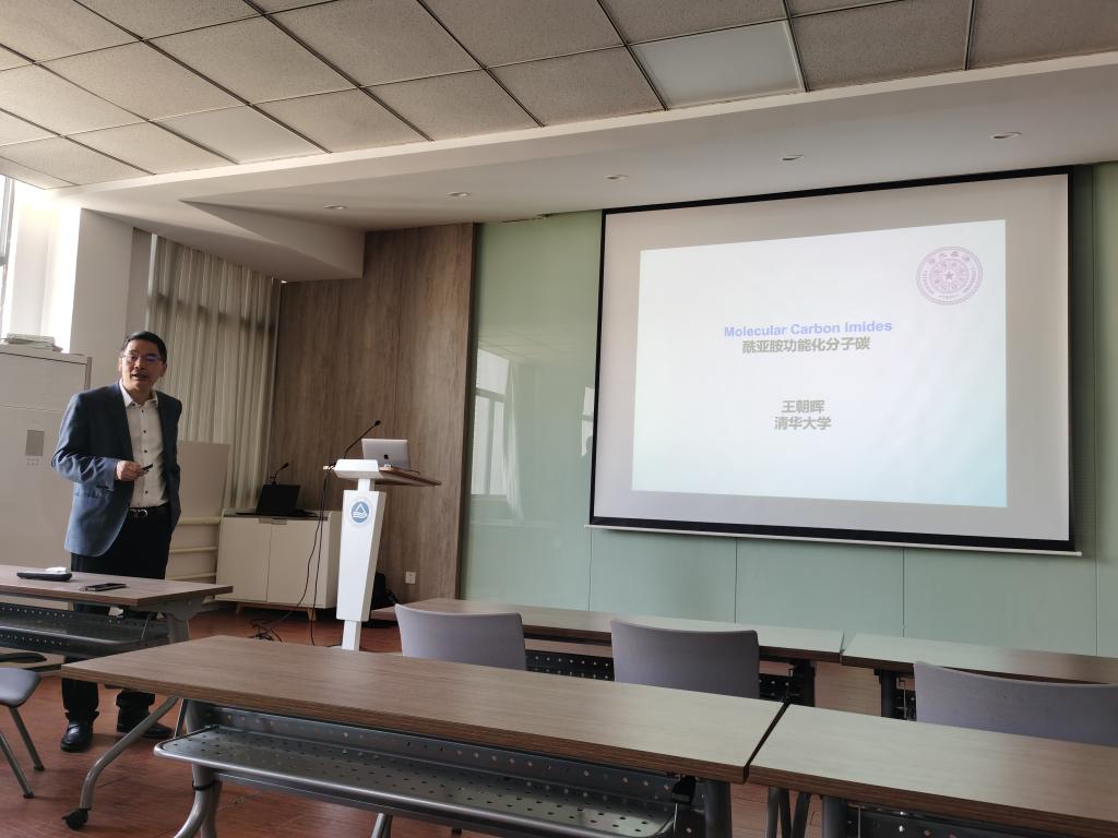 董亮亮副教授主持了该报告会,对王朝晖教授和杨晓伟教授的来访致以热烈的欢迎,学院众多师生参加了报告会。王朝晖着重介绍了分子碳对揭示碳纳米材料结构性能构效关系具有十分重要的意义,系统介绍了团队近年来基于核心稠环结构-莱啉(Rylene)酰亚胺的相关研究工作,并指出这类分子基纳米碳具有合成灵活、结构可定制、性能多样、加工性能和稳定性优异等特点,王朝晖逐层递进,激发了在场老师同学的学习兴趣,讲座结束后,王朝晖就该领域的相关问题同参会老师和同学们进行了交流讨论。