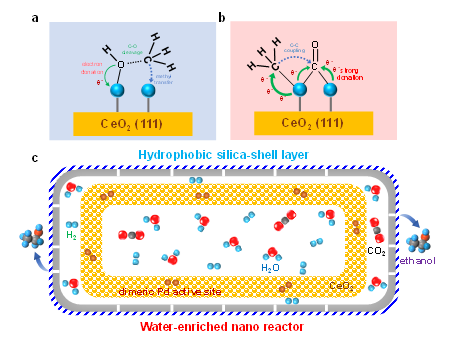 图2.结构封装双钯活性位点-纳米“蓄水”膜反应器(a,无蓄水功能的结构封装Pd2Ce@Si催化剂;b,具有蓄水功能的结构封装Pd2Ce@Si16催化剂)对CO2加氢一步制乙醇的催化性能的影响