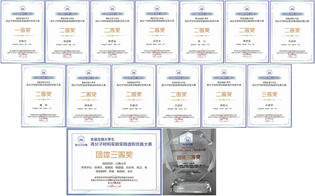 化学与材料工程学院高分子材料与工程专业共18名学生参加本届双实仿真大赛。参赛同学认真复习专业理论知识,反复进行虚拟仿真操作练习,最终在大赛中展现了扎实的高分子化学与物理知识以及过硬的心理素质,斩获学生个人一等奖(张炳炎)1项、二等奖(安美霖、陈嘉瑜、孙庆华、张卫等)11项、三等奖(任星宇)1项以及团体三等奖(6/30)。通过本次大赛,进一步夯实了参赛同学的专业知识,提升了实践能力,锻炼了心理素质,为今后的专业学习、专业实验实践以及科学研究奠定了良好的基础。