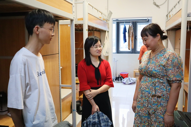 家长会后,董霞、鞠峰和马航威走访新生宿舍。“来自哪里啊?”“大学生活适不适应啊?”“校园目前有多走动了解一下吗?”亲切的问候让同学们在阴雨连绵的江南感受到了来自化工学院的温暖。领导与同学们聊到了校园生活的方方面面,也谈到了未来四年的学业规划,在走访的过程中,领导们也感受到了不同的宿舍氛围……老师们在送去温暖的同时还对宿舍进行了安全排查,确保新生入住的安全性和舒适性。