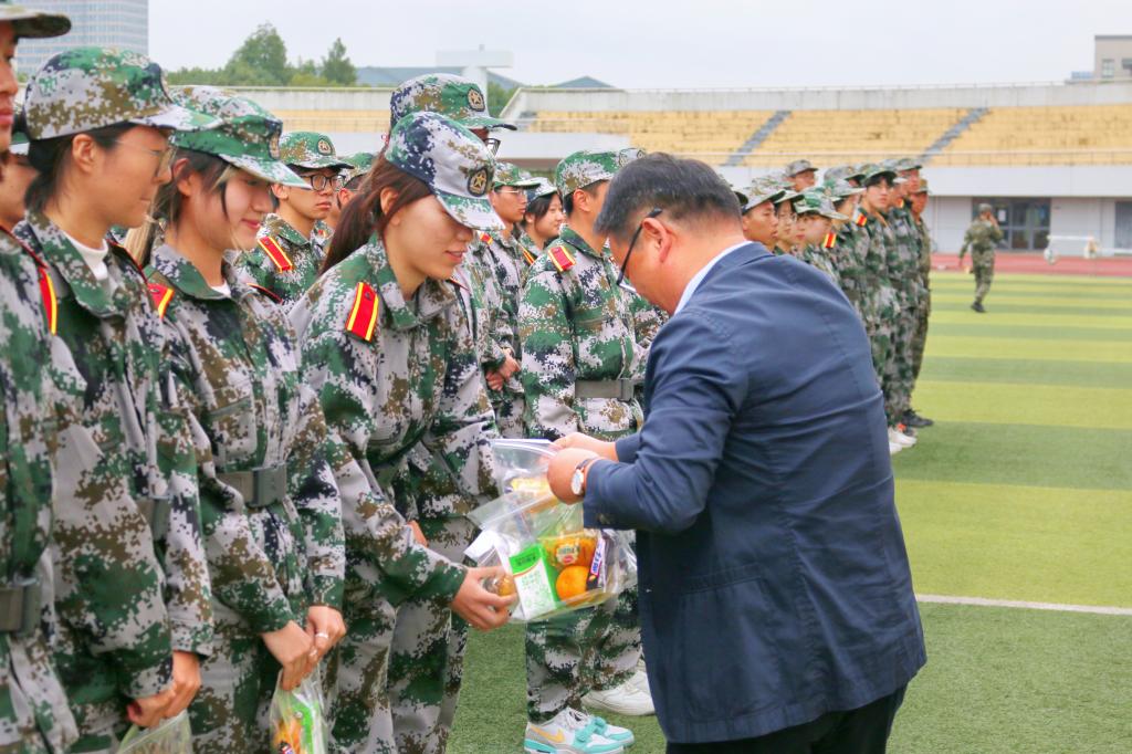 成果展示之后,潘庆伟进行讲话。他首先对承训教官表示感谢,对2022级学生的精神面貌给予肯定和赞扬。他指出,2022级学生虽然已经在校学习一年,但精神上仍不能放松,应继续保持朝气蓬勃的精气神,努力奋发,认真完成好每一项任务,扎实走好每一步。同时,他号召同学们要了解军人,致敬军人,践行“听党指挥、能打胜仗、作风优良”的队伍建设要求,传承“召之即来、来之能战、战之必胜”的军人意志,铸就精神钢铁长城。讲话结束后,学院领导老师为参训学生发放慰问品。