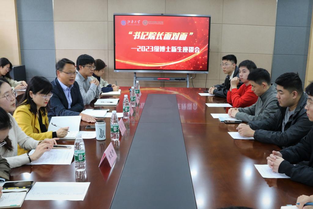 11月8日下午,化学与材料工程学院“书记院长面对面”2023级博士新生座谈会在化工楼A316会议室举行,学院党委书记潘庆伟、院长刘仁、人事秘书朱雯倩、研究生秘书苏慧、实验室安全管理员严洋洋、辅导员高静及全体博士新生参加本次座谈,会议由学院党委副书记、副院长董霞主持。