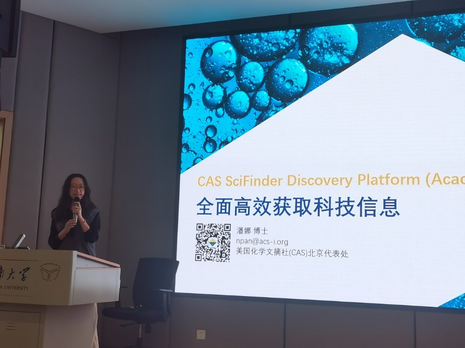 为了帮助学院研究生全面高效地检索数据库信息,精确筛选文献,提高论文写作能力,化工学院于11月9日在东氿校区知行楼C106报告厅内举办“SciFinder Academic美国化学文摘库(CA)、ACS数据库”培训讲座。本次讲座邀请了美国化学文摘社(CAS)潘娜博士主讲,帮助同学们利用CAS SciFinder Discovery Platform精准筛选文献、确认研究课题的新颖性、追踪关注领域的最新进展、启发逆合成路线设计、高效获取能直接用于实操的合成方法或分析方法等。